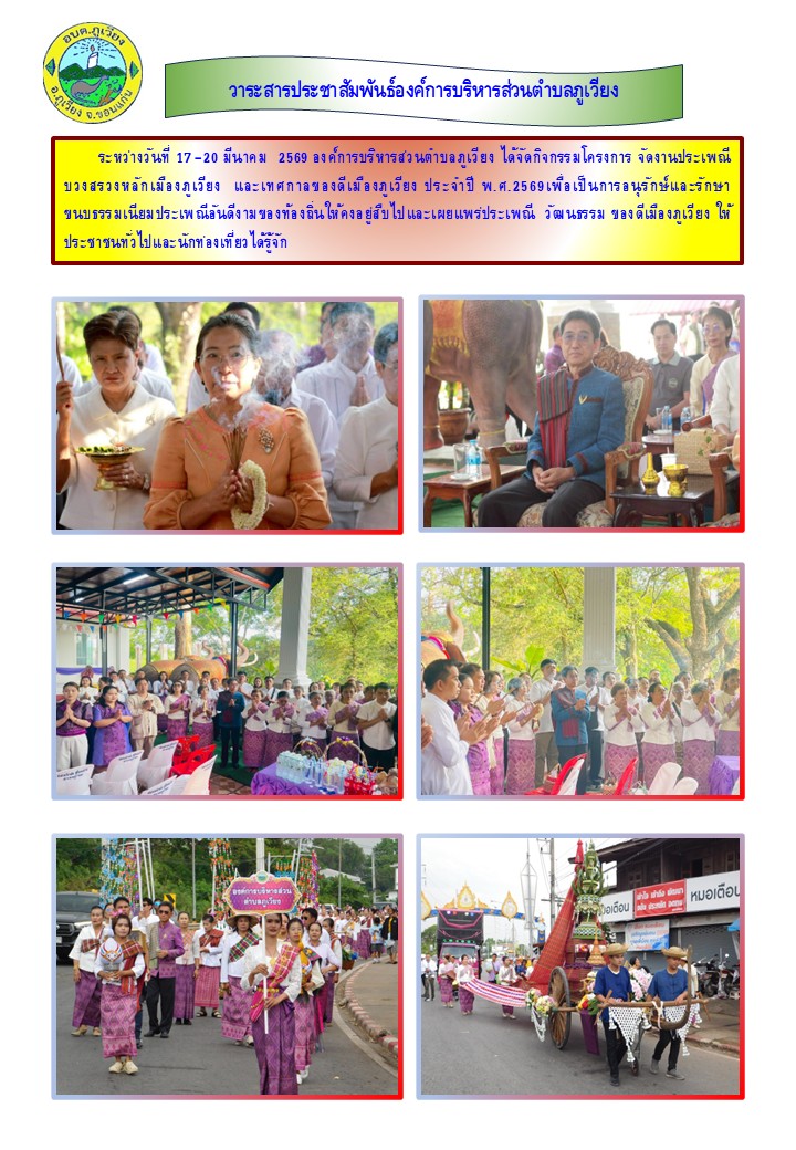 ระหว่างวันที่ 17-20 มีนาคม 2569 องค์การบริหารส่วนตำบลภูเวียง ได้จัดกิจกรรมโครงการจัดงานประเพณีบวงสรวงหลักเมืองภูเวียง และเทศกาลของดีเมืองภูเวียง ประจำปี พ.ศ. 2569 เพื่อเป็นการอนุรักษ์และรักษาขนบธรรมเนียมประเพณีอันดีงามของท้องถิ่นให้คงอยู่สืบไปและเผยแพร่ประเพณี วัฒนธรรม ของดีเมืองภูเวียง ให้ประชาชนทั่วไปและนักท่องเที่ยวได้รู้จัก